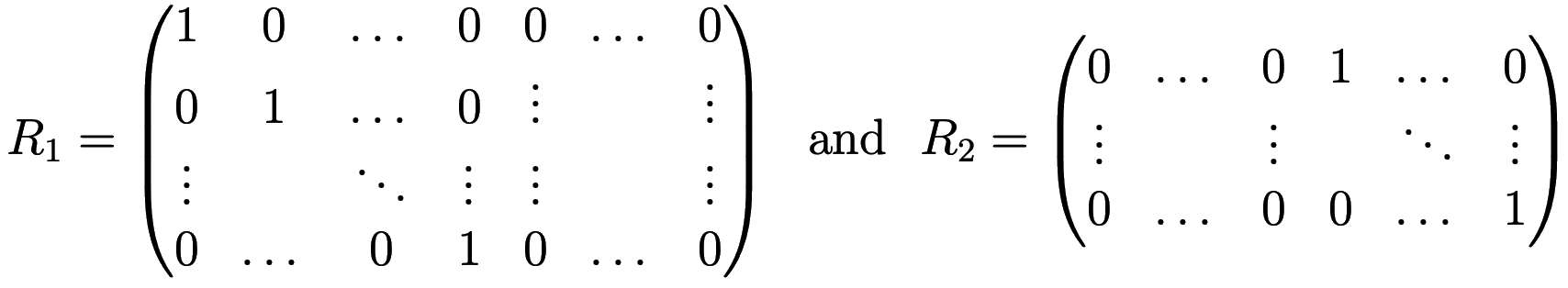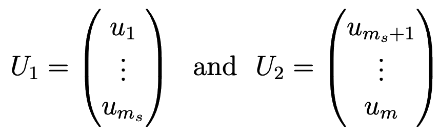 In matrix notation the solution can be written as $U_i=R_iU$, where the restriction operator $R_1$ is a $m_s\times m$ matrix consisting of two parts of sizes $m_s\times m_s$ and $m_s\times(m-m_s)$, and $R_2$ is a $(m-m_s)\times m$ matrix consisting of two parts of sizes $(m-m_s)\times m_s$ and $(m-m_s)\times(m-m_s)$, respectively: